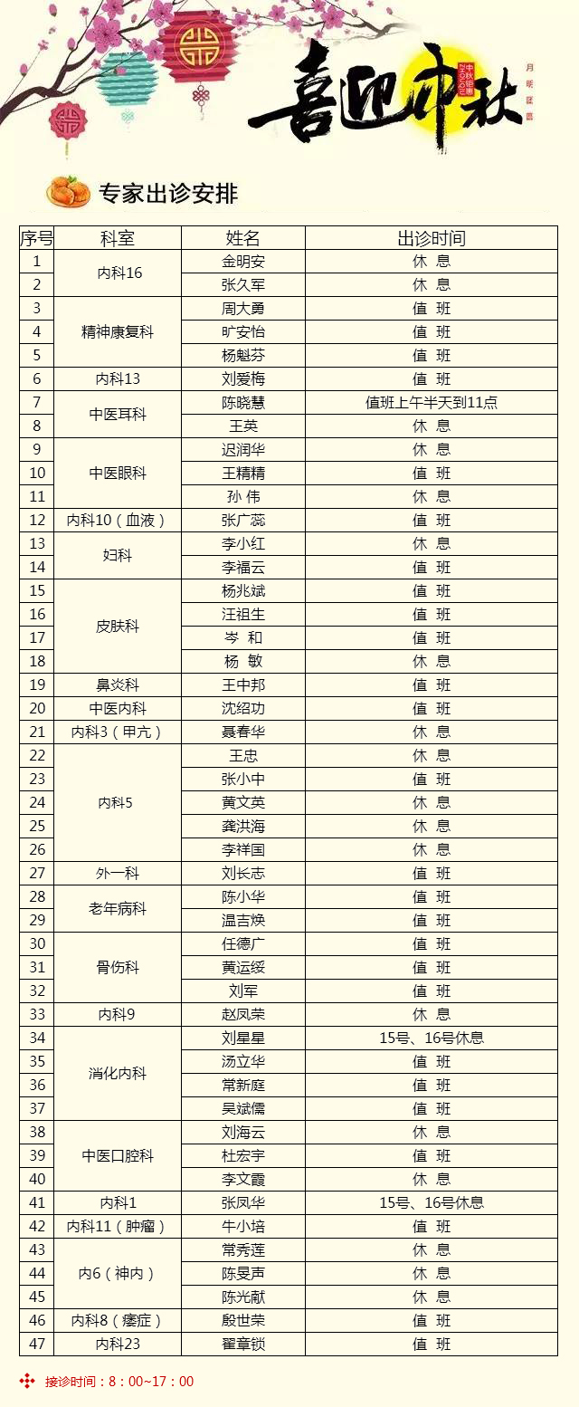 【就诊指南】中秋佳节,专家坐诊时间表为您呈上