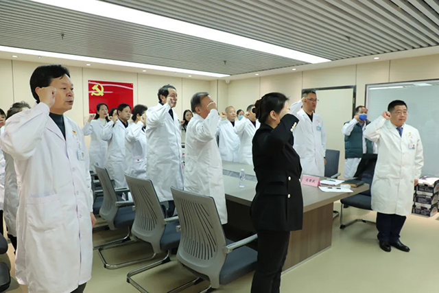 仪式迎来了庄严神圣的一刻,在新任党支部书记胡伯杰的带领下,全体党员面向鲜红的党旗,高举右拳,重温入党誓词。铿锵有力的誓言,字字千钧,响彻会场,涤荡心灵。这是对初心使命的又一次铭记,更是对守护人民健康事业的庄严承诺。